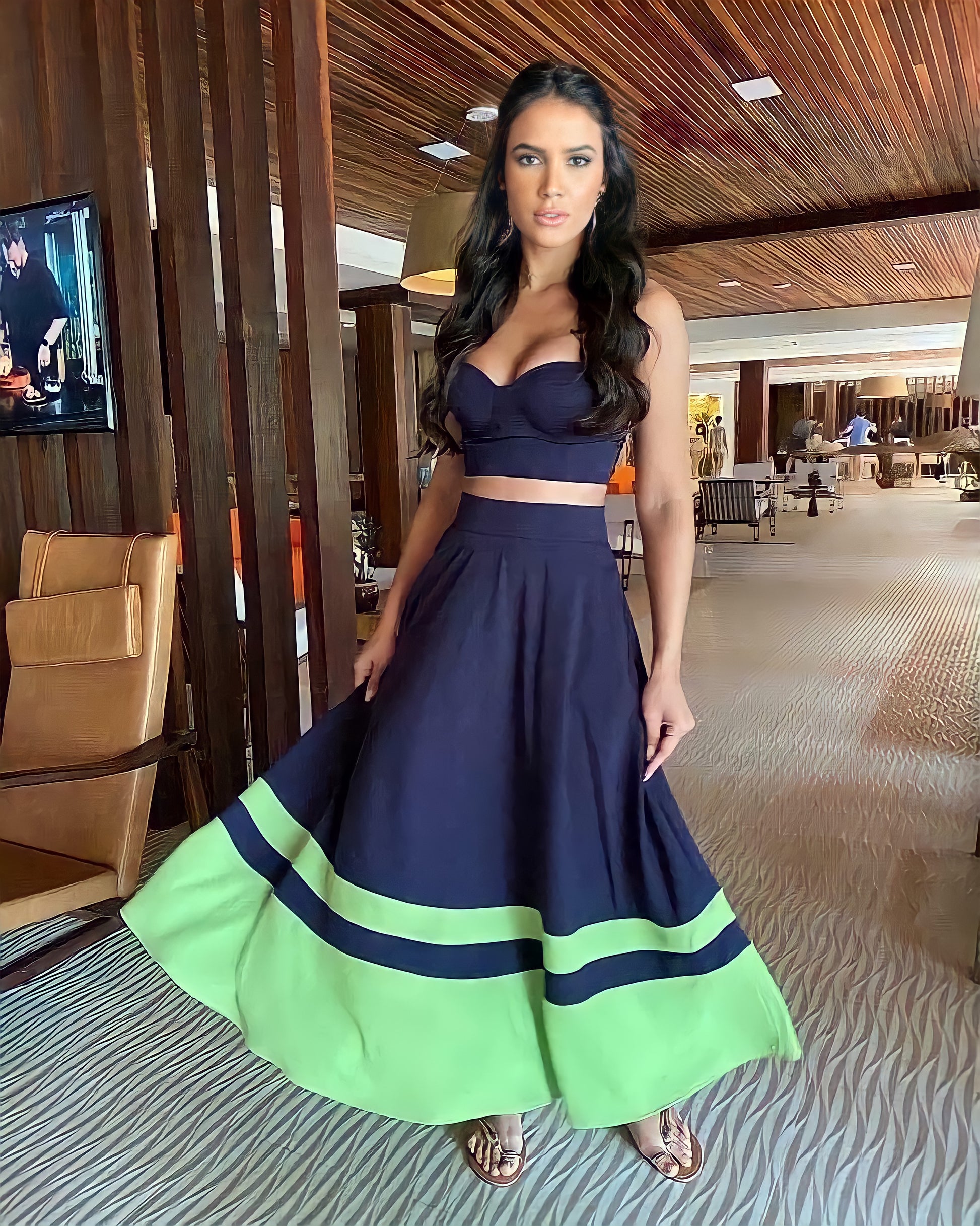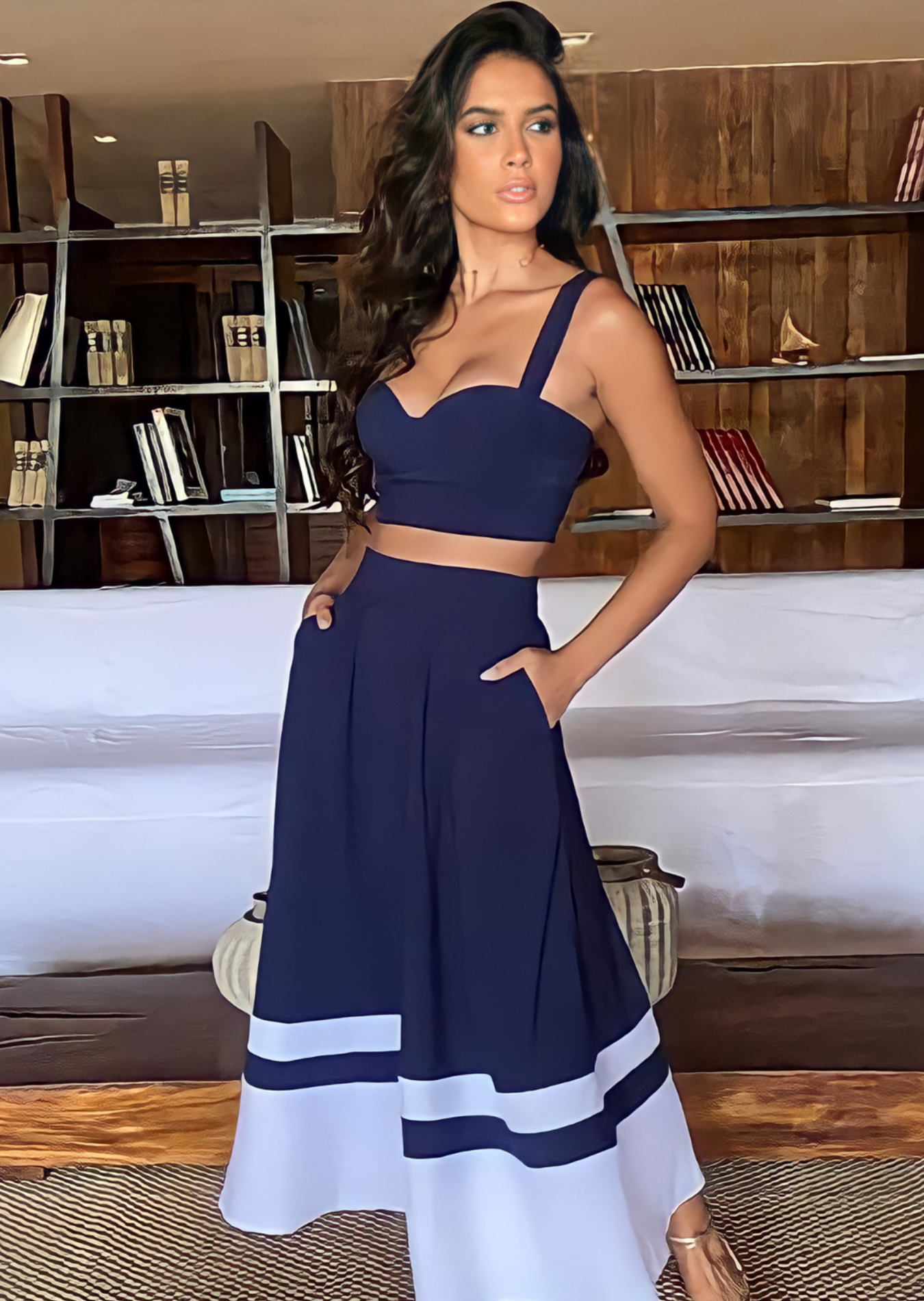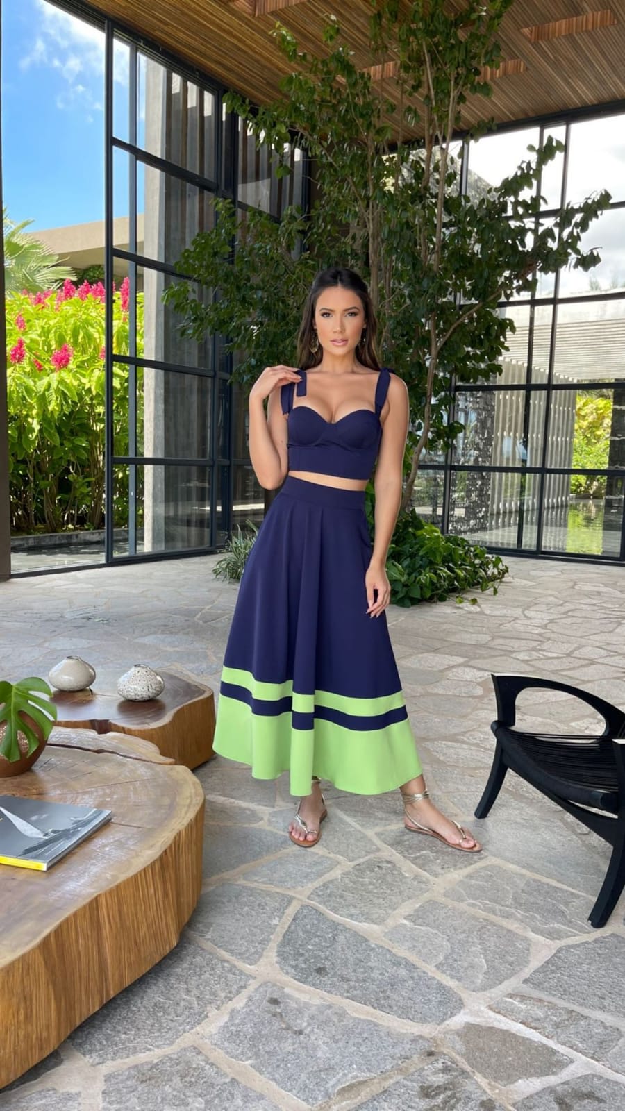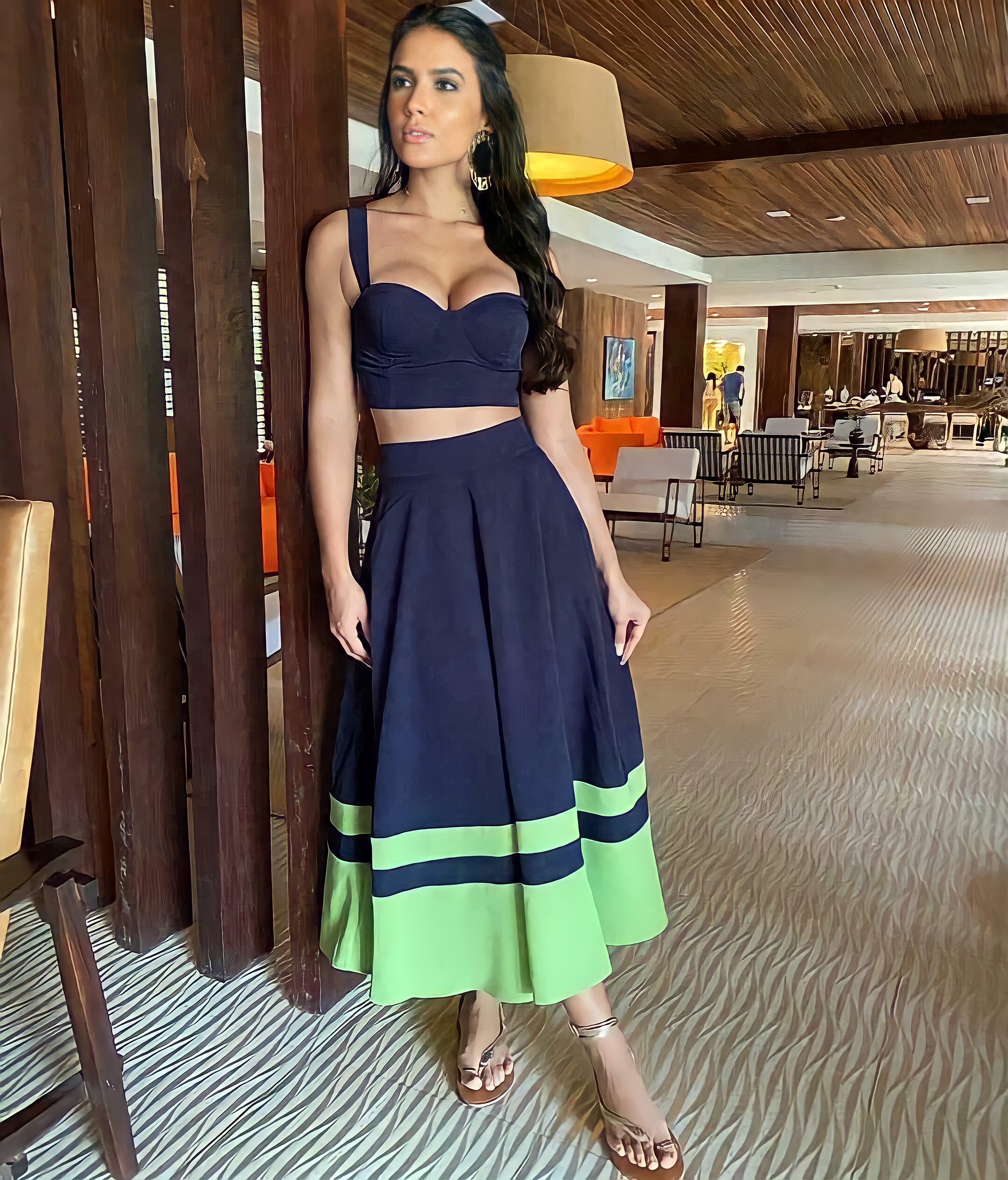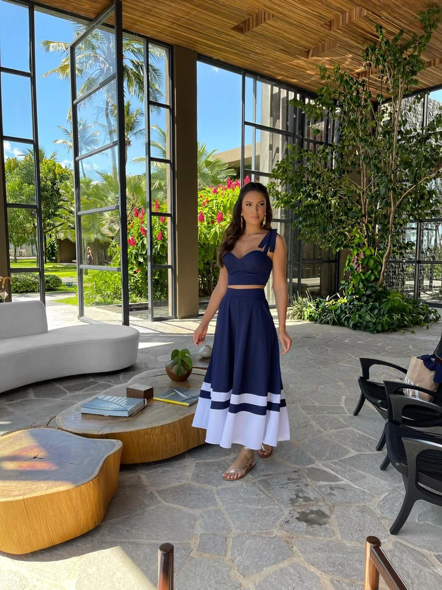 O conjunto clássico godê é composto por um cropped com alças reguláveis e decote coração, que valoriza o colo e dá um ar feminino e romântico ao look, além da saia midi godê com bolsos laterais, que reforça a feminilidade e aumenta a silhueta.