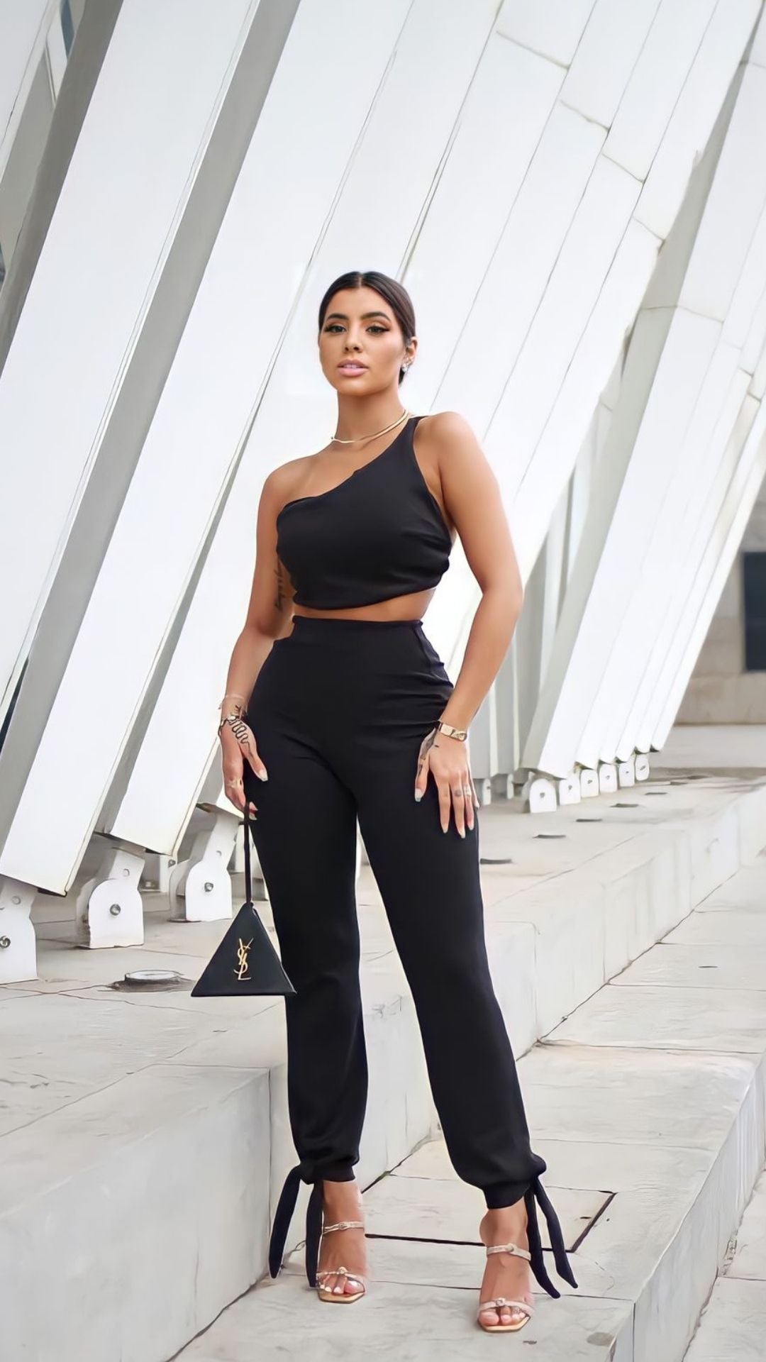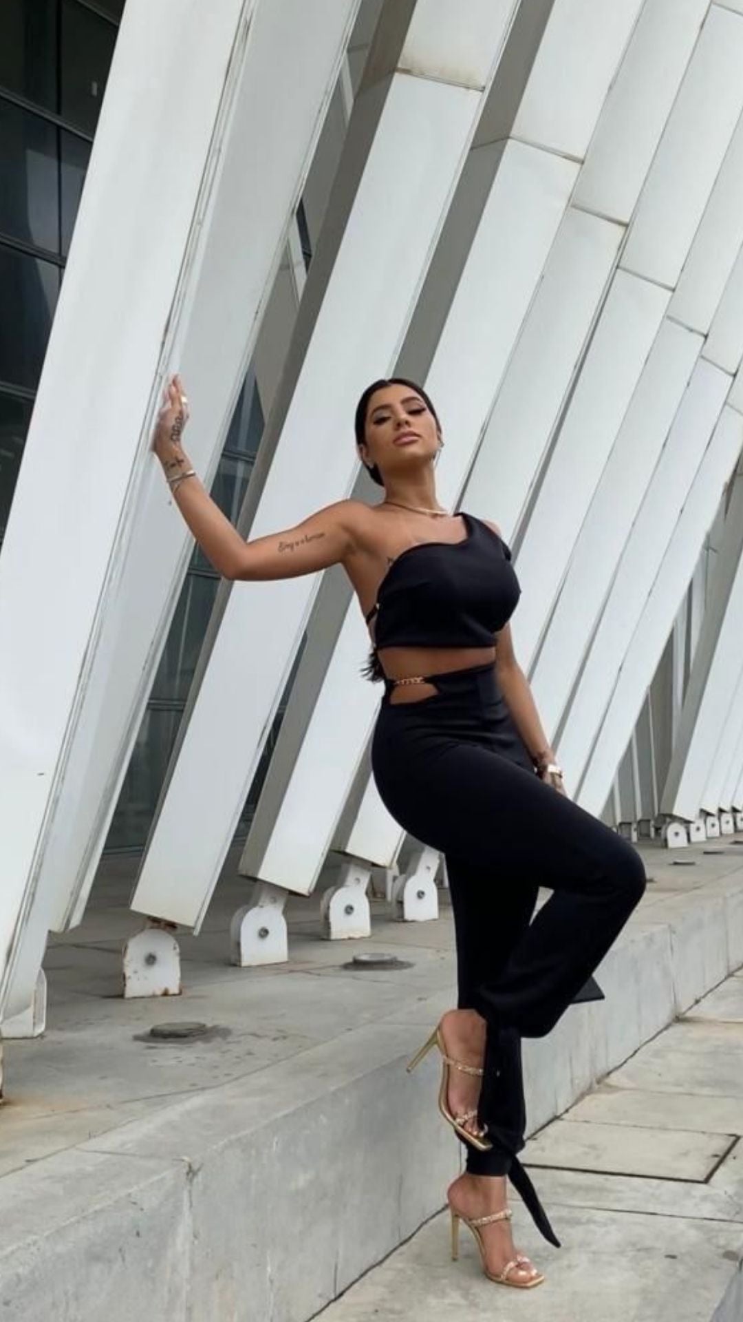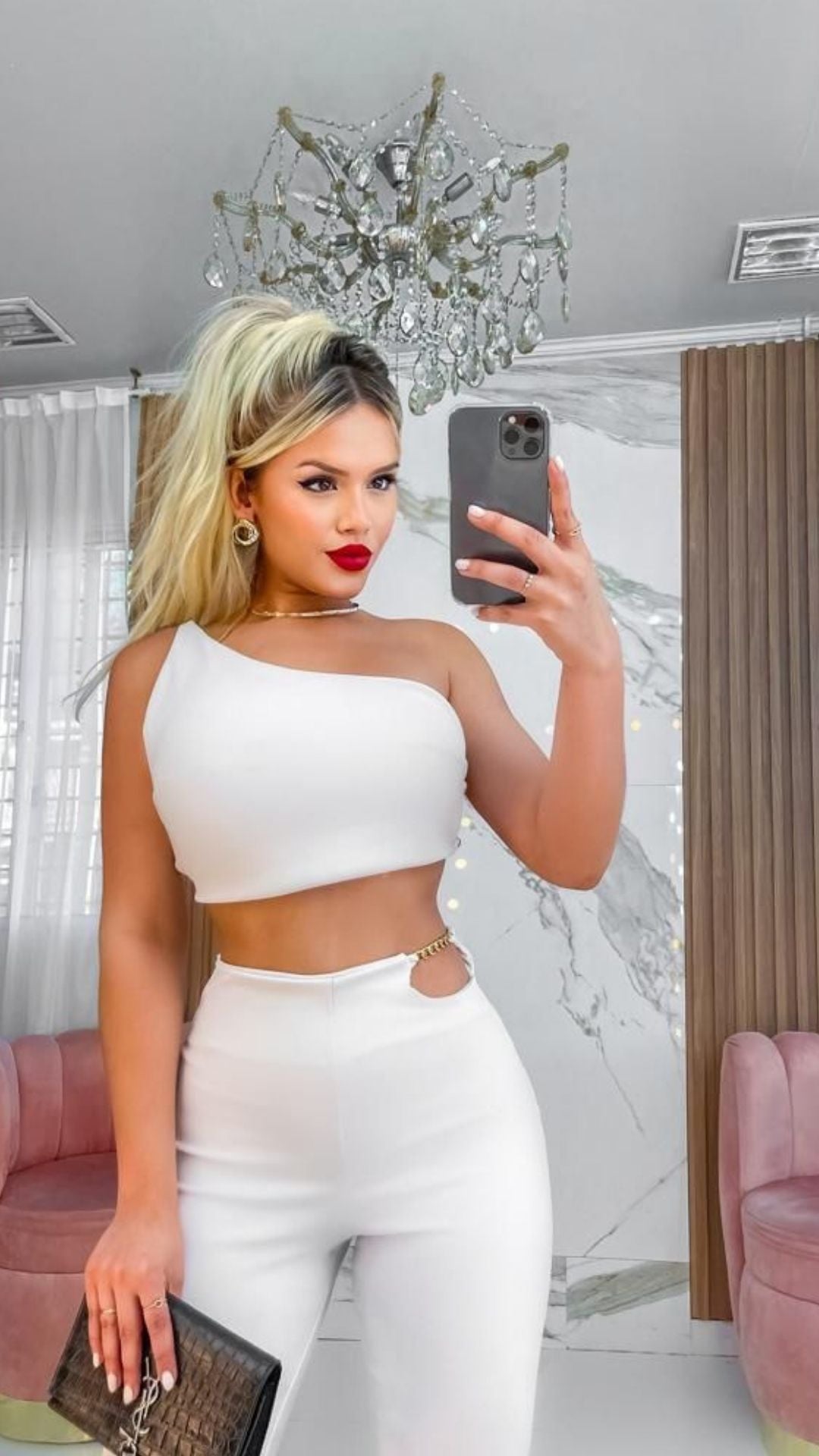 O cropped com bojo de sustentação que ajuda dar um Up nos seios, decote incrível de uma alça apenas acompanha calça de cintura mediana com corrente lateral um modelo diferenciado, ousado e customizado que virou trend. Uma peça totalmente personalizada, mais gringa impossível.