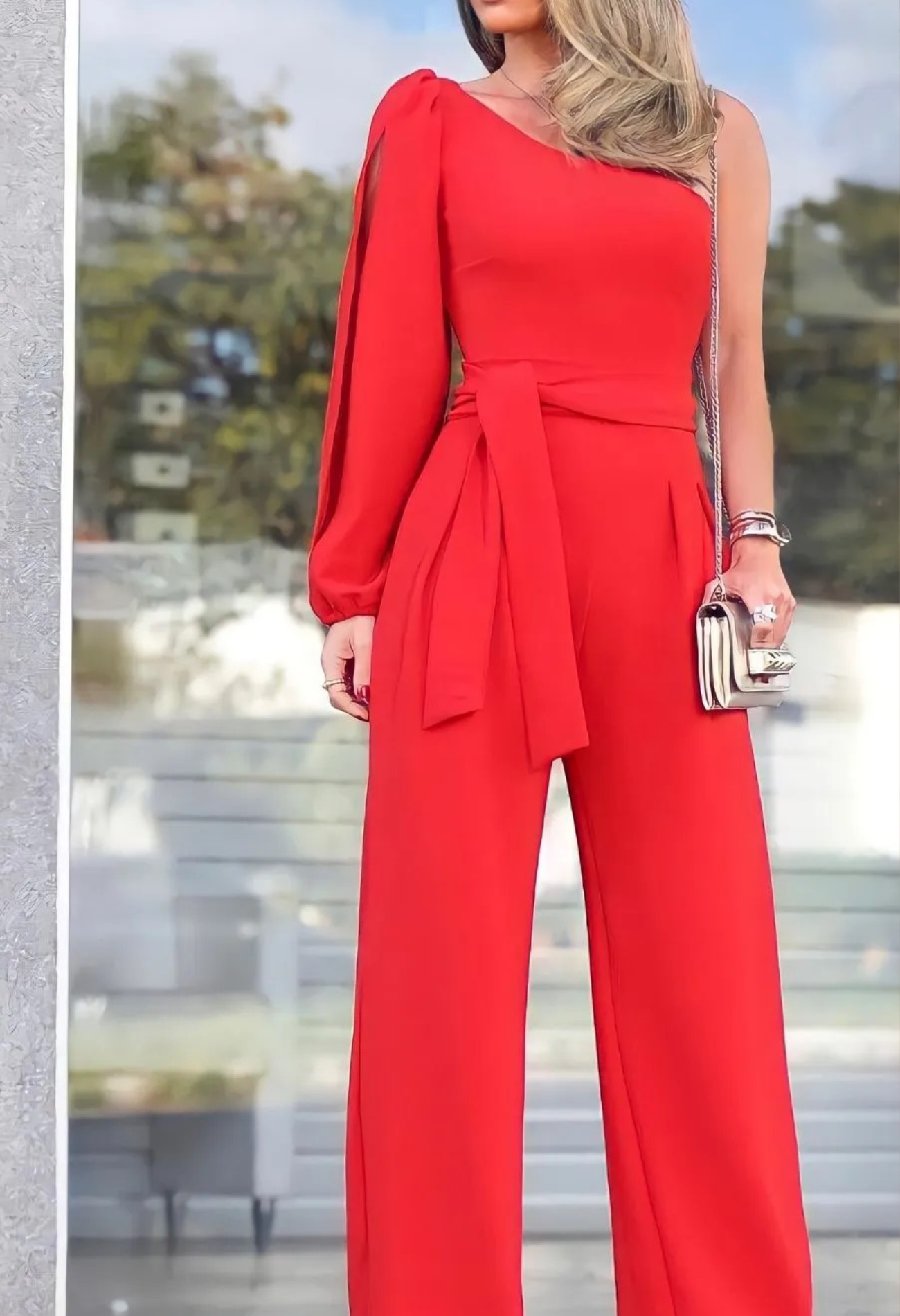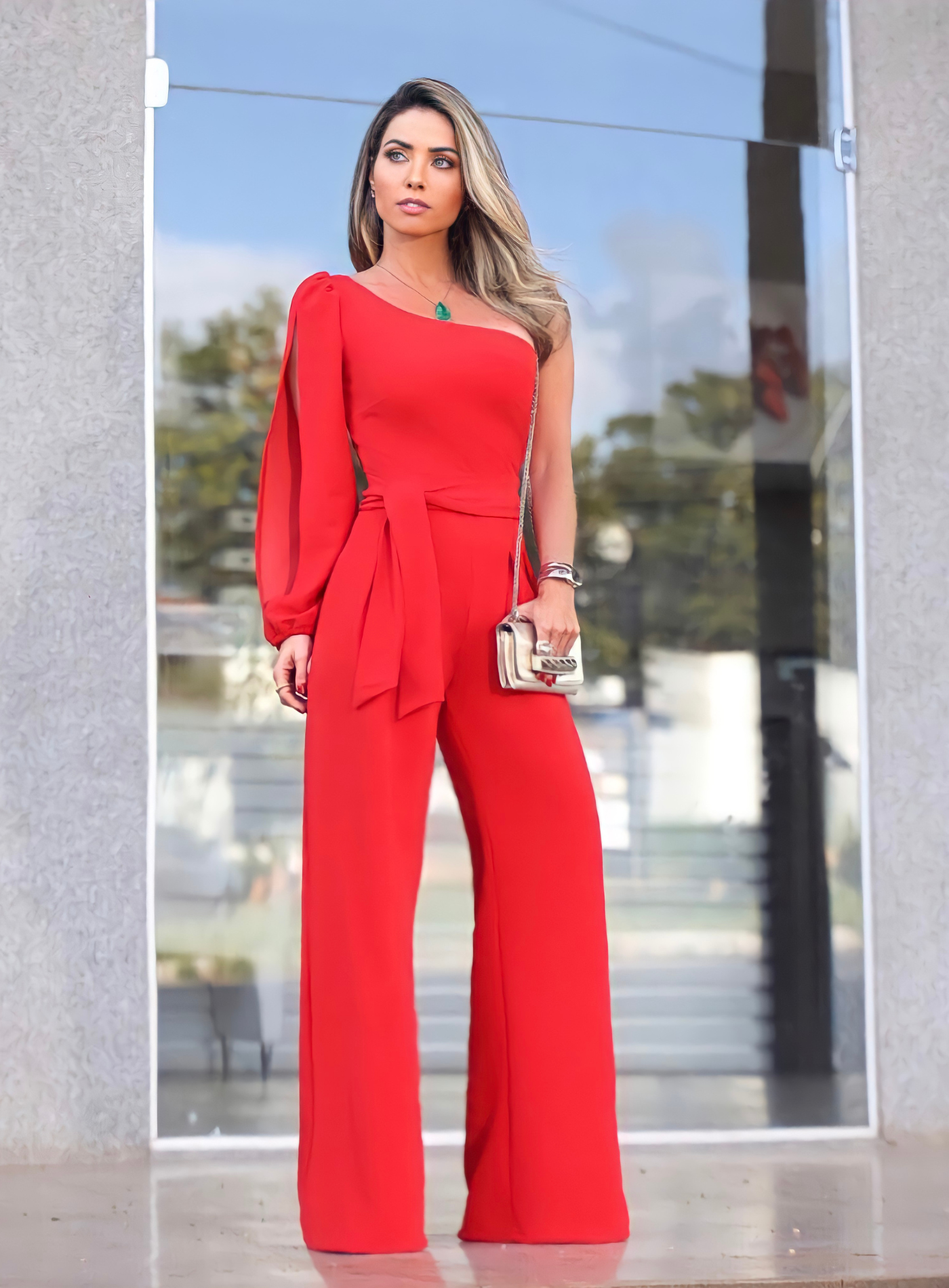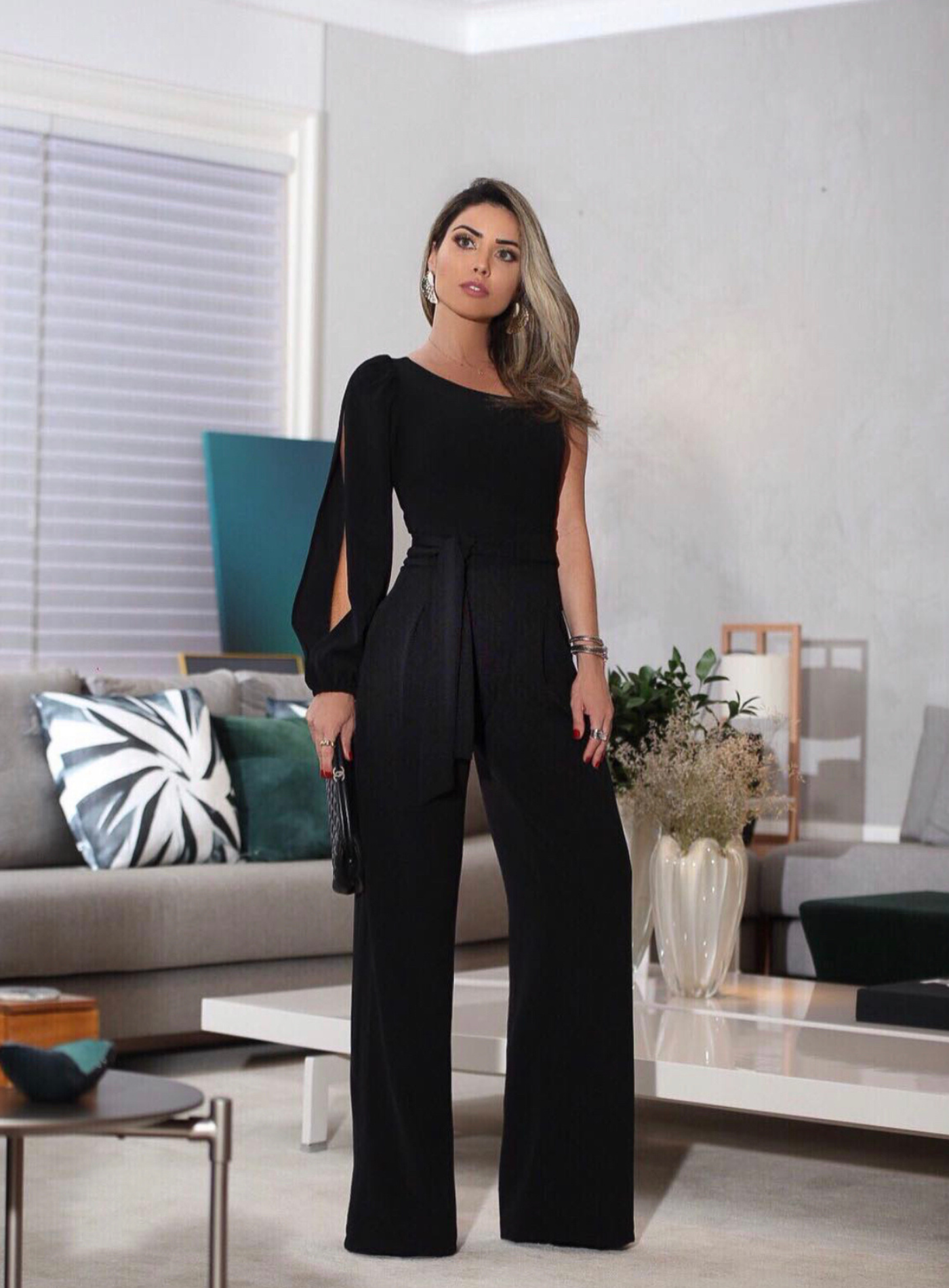 Macacão leve e confortável para o verão e elegante para noite, amarração na cintura dando uma boa cinturada, decote assimétrico de um ombro só .